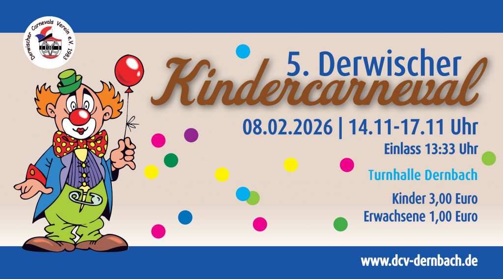 Am 4. Februar laden wir Klein und Groß zu unserem 3. Derwischer Kindercarneval ab 14.11 Uhr in unsere o.g. Turnhalle ein. Neben viel Luftballons, Luftschlangen und guter Carnevals Musik bieten wir auch hier ein tolles Kinderprogramm. Hier treten neben unseren eigenen Kinder- und Jugendtanzgruppen auch tanzfreudige Kindertanzgruppen der benachbarten Orte auf.
